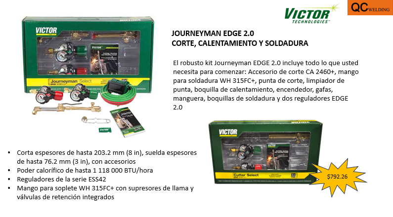 El robusto kit Journeyman EDGE 2.0 incluye todo lo que usted necesita para comenzar: Accesorio de corte CA 2460+, mango para soldadura WH 315FC+, punta de corte, limpiador de punta, boquilla de calentamiento, encendedor, gafas, manguera, boquillas de soldadura y dos reguladores EDGE 2.0